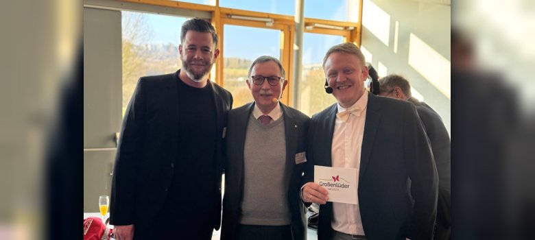 Sebastian Sander, Vorsitzender des Gewerbevereins Großenlüder e. V., mit Bernhard Keller und hr-Moderator Jonas Schulte
