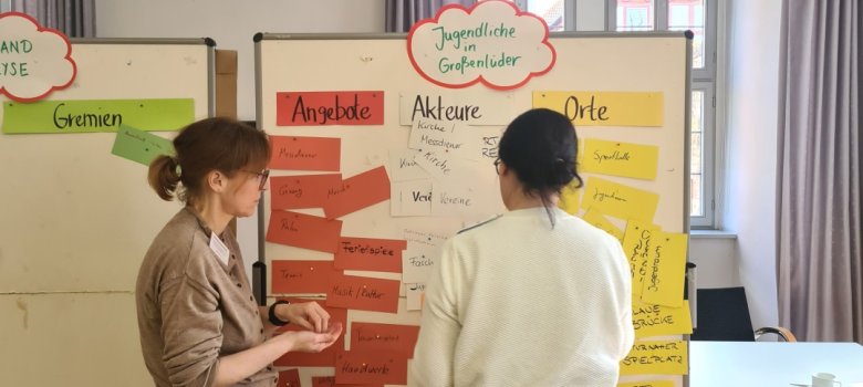 Aktives Mitwirken bei der Ist-Stand-Analyse: Moderatorin Swantje Schindehütte (links) mit Kathrina Hosenfeld, 1. Beigeordnete der Gemeinde (von hinten).